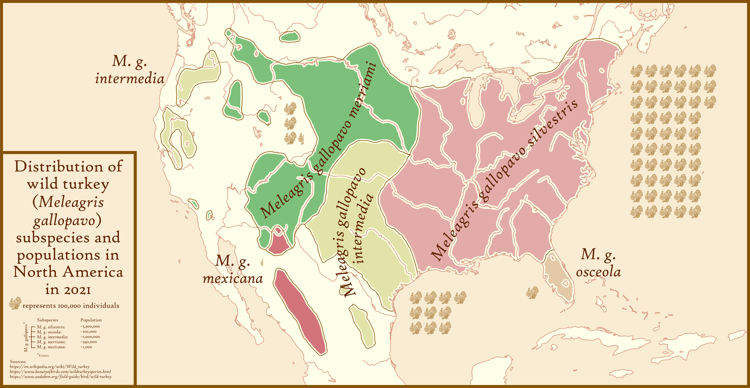 For Thanksgiving 2021, I made this map, showing the distribution and population sizes of different subspecies of turkey in North America (the original native subspecies of which is now extinct).