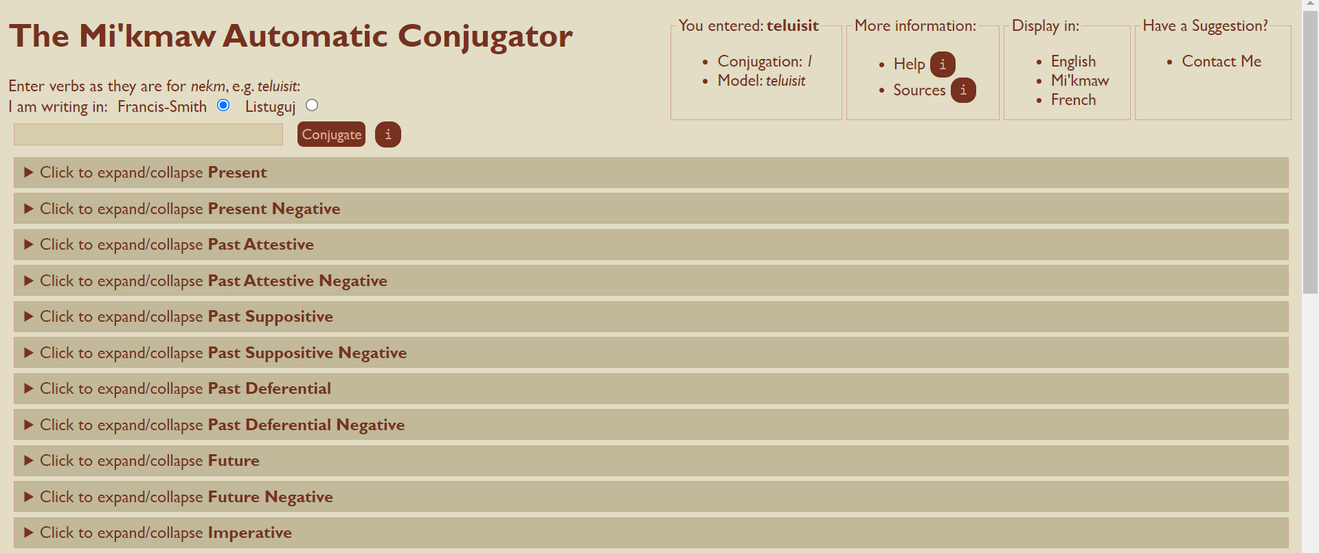 The conjugator supports user in both Francis-Smith and Listuguj orthographies. Choose the orthography you are writing in with the radio button option above the entry field, and the conjugator will output the rest of the verb forms in the orthography you have selected. “teluisit” (to be named) is used as an example when first arriving on the page, to show what the output can look like.